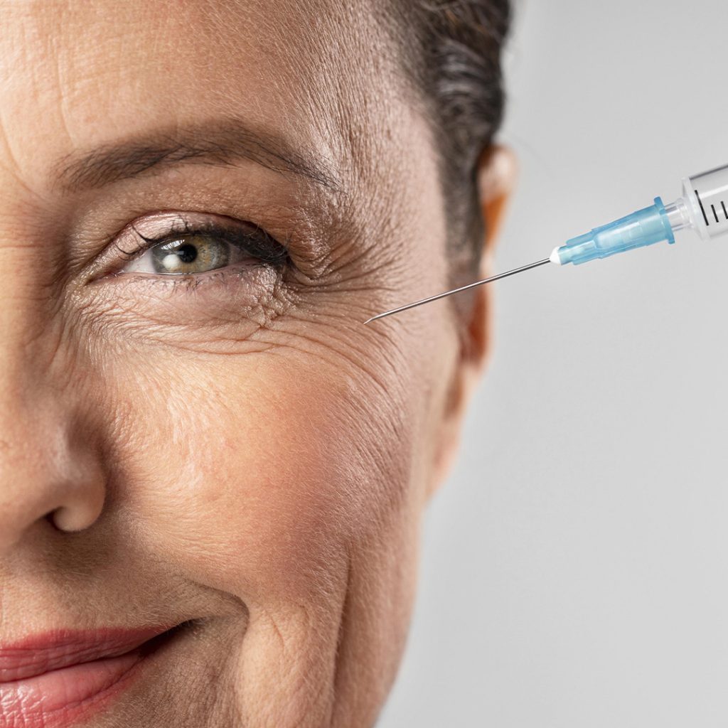 A forma cosmética da toxina botulínica é uma injeção não cirúrgica que temporariamente reduz ou elimina linhas de expressão, rugas na testa, pés de galinha perto dos olhos e bandas grossas no pescoço.